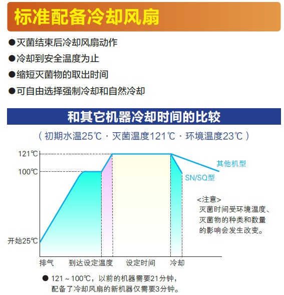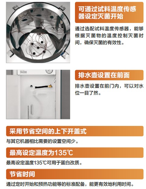 高溫度達135℃,也可用于蛋白改質(zhì)。 通常的滅菌,以及培養(yǎng)基、液體的滅菌和培養(yǎng)基的溶解都能通過簡單的設(shè)定進行操作。 除了各滅菌程序的設(shè)定,可以設(shè)定任意工程,進行重復運行。 標準裝備有縮短冷卻時間的冷卻風葉。 操作面板及顯示器都裝在上蓋的前面,方便觀看和操作。 設(shè)有多重壓力蓋開啟保護鎖,各種安全保護措施充分。 SQ為低床型,高度非常適合滅菌物的拿取。