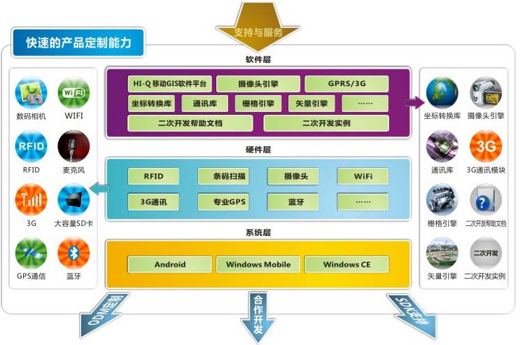 軟件定制:HI-Q移動GIS軟件平臺,攝像頭引擎,坐標轉換庫,通訊庫,柵格引擎,矢量引擎,二次開發(fā)幫助文檔,二次開發(fā)實例等;