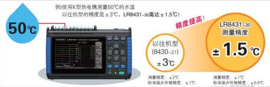 例如:使用K型熱電偶測量50℃的水溫,以往機(jī)型的精度是±3℃,LR8431-30高達(dá)±1.5℃