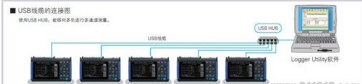 USB線纜的連接圖:使用USB HUB,能夠?qū)Χ嗵庍M(jìn)行多通道測量